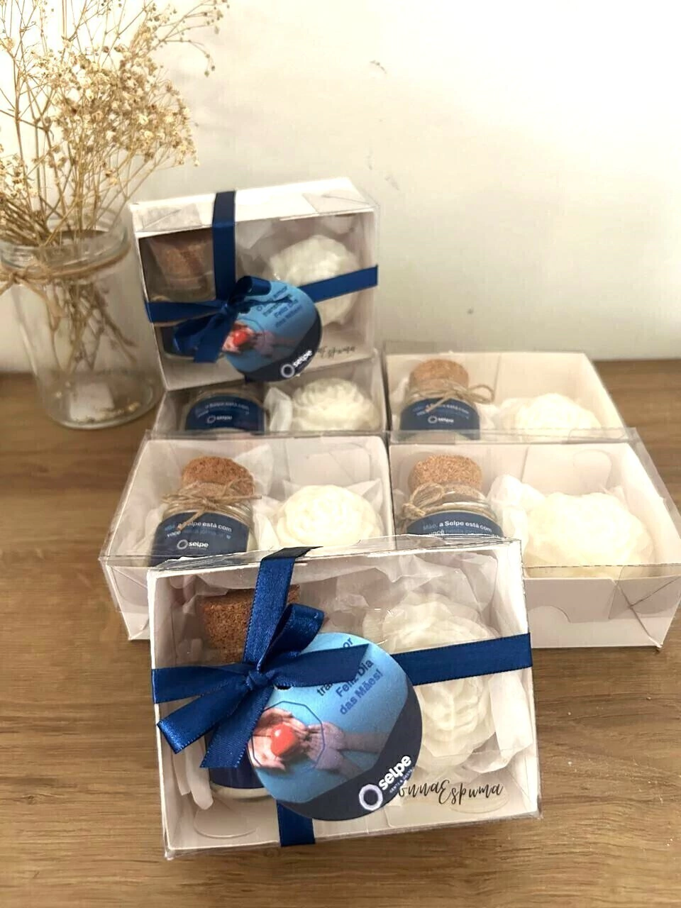 Nossa caixinha especial para presentear vem com uma duplinha (sabonete e vela aromática) no tamanho perfeito para quem recebe-lo experimentar e ver do que gosta mais!