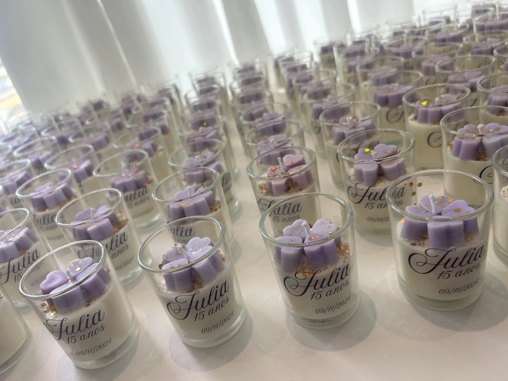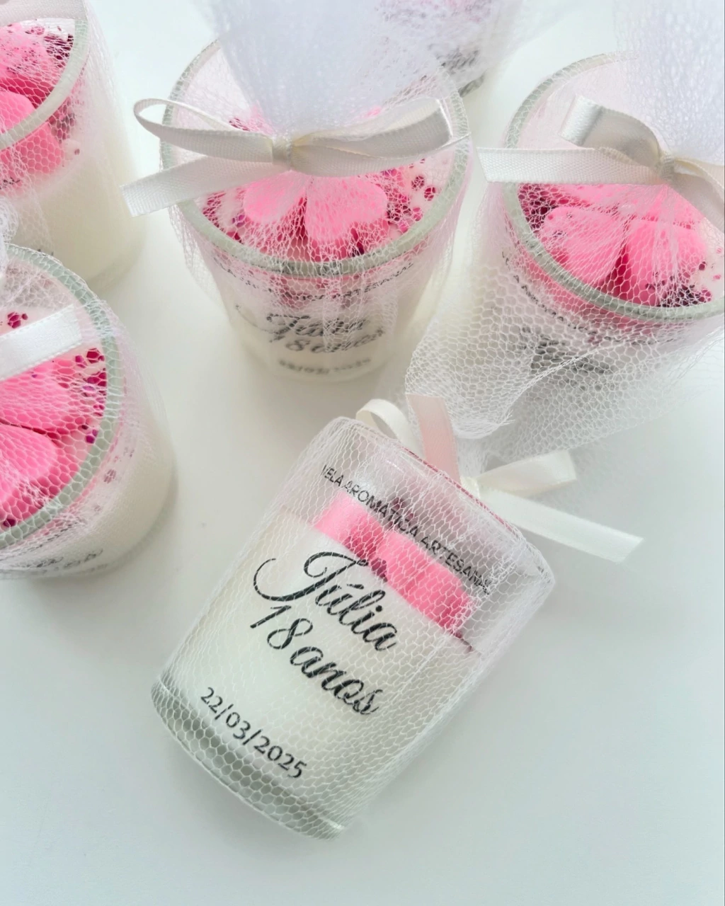 Essas são mini velas aromáticas cheia de detalhes lindos que vão encantar ainda mais a sua festa!