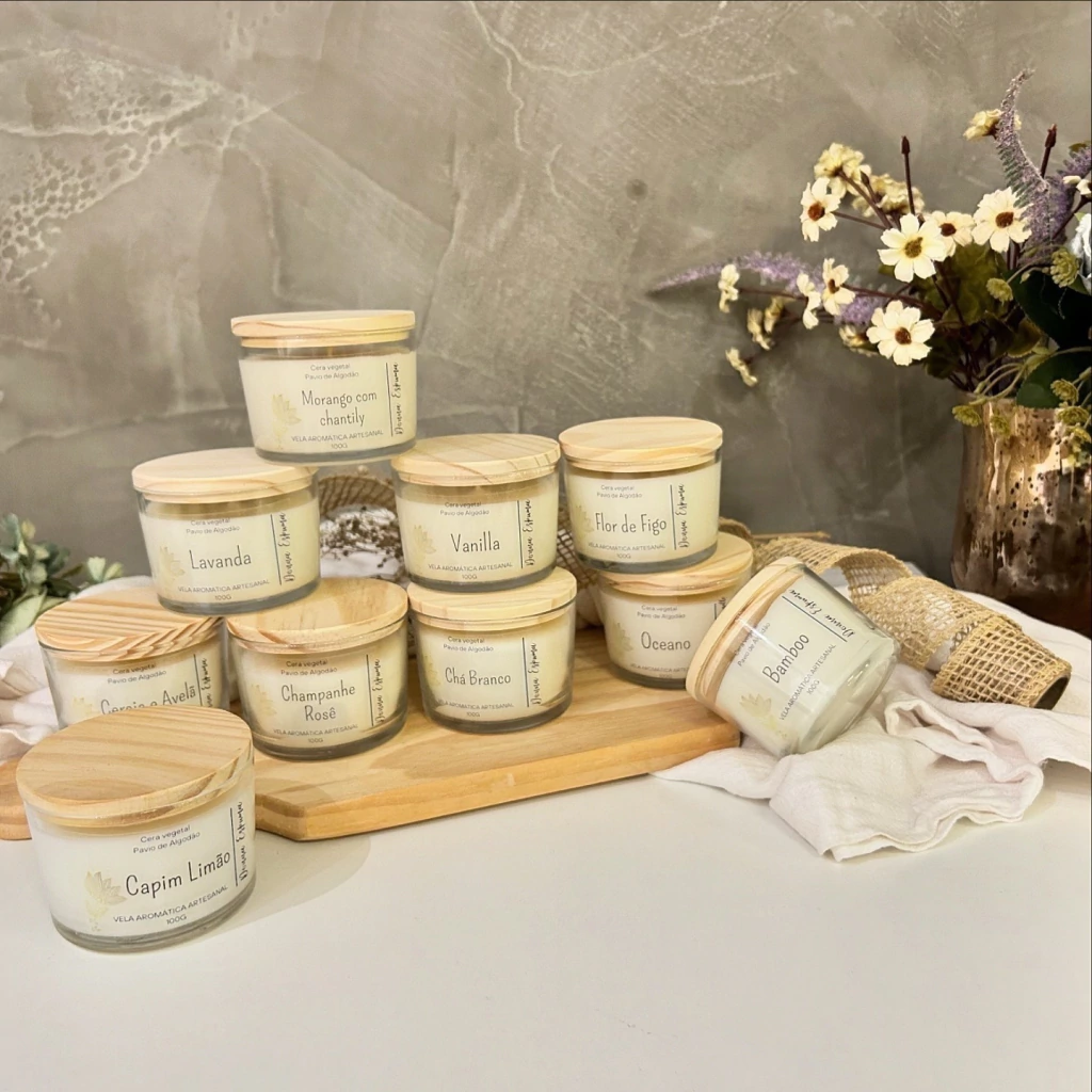 Vela aromática artesanal feita com blend de Cera de coco, palma e arroz, sem uso de parafina,