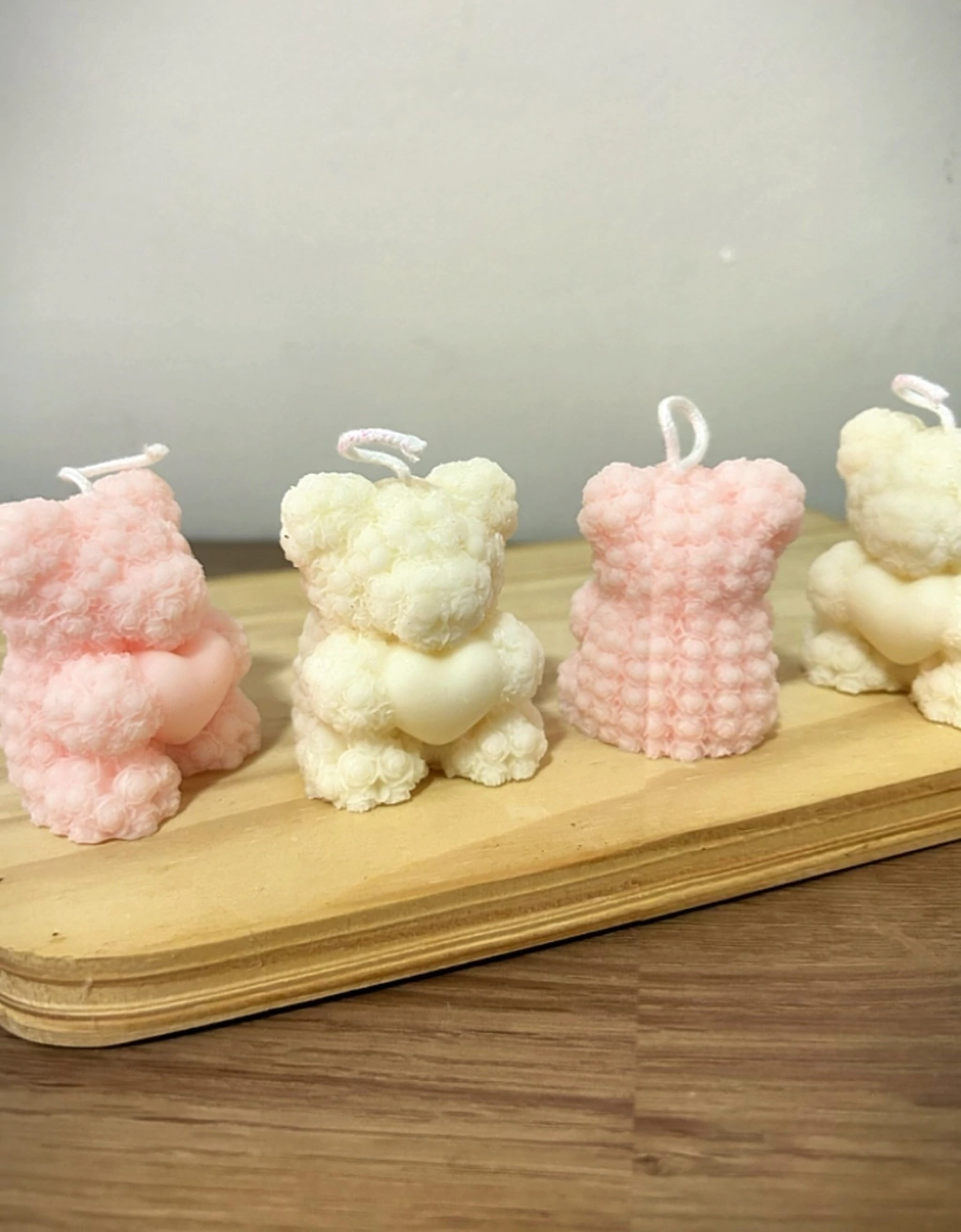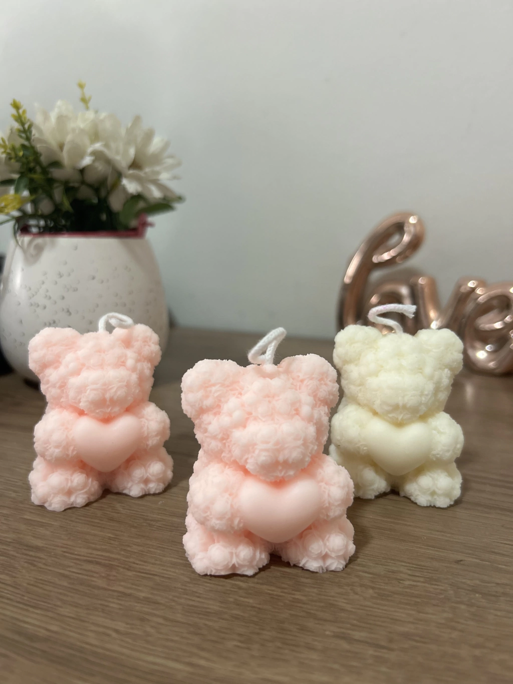 Vela aromática em formato de urso com coração na mão